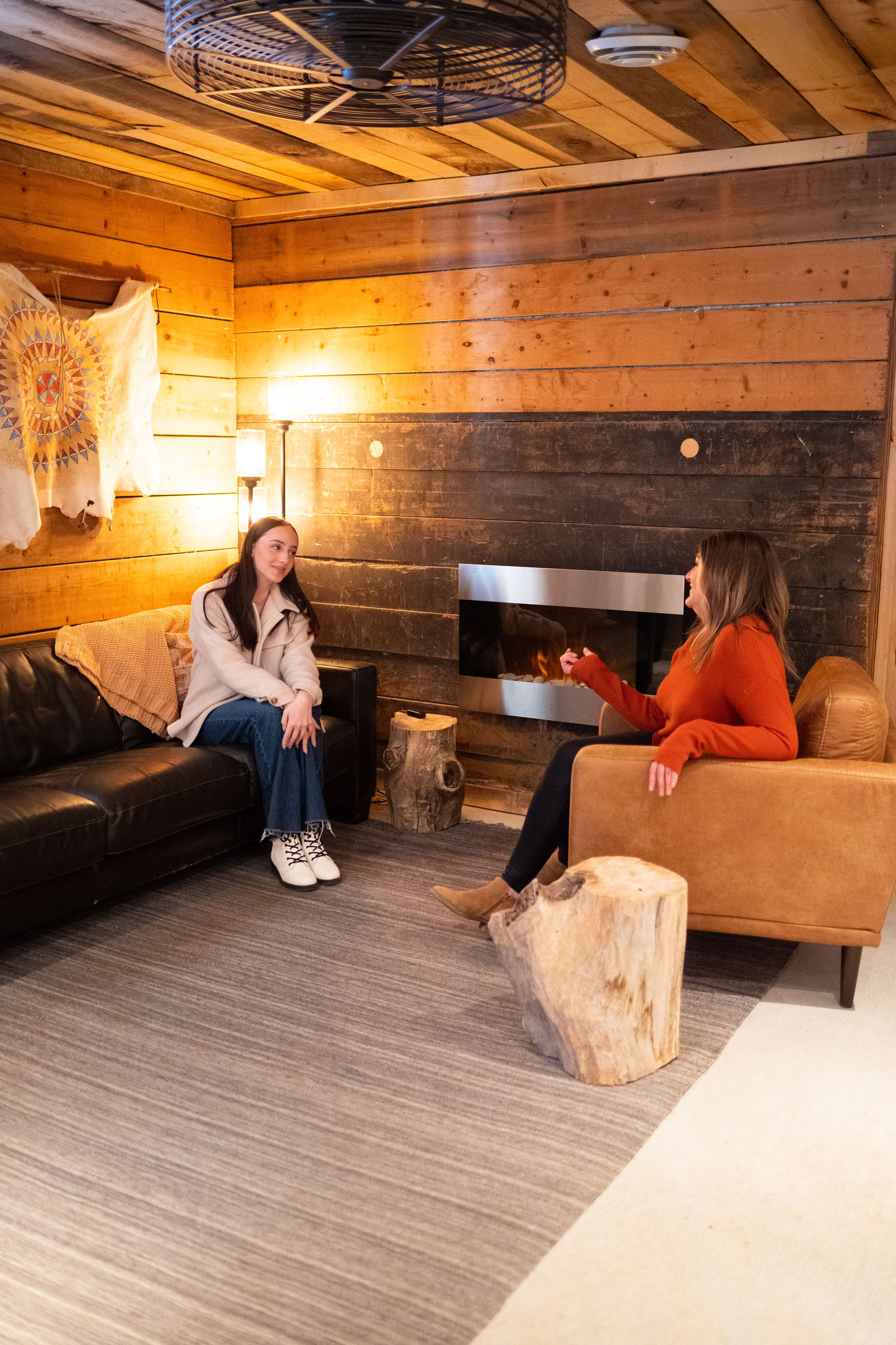 - Beautifully decorated offices include couches, chairs, desks, and faux fireplaces.